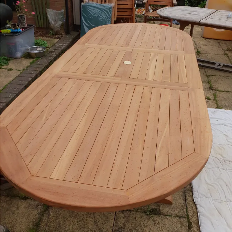 Our oval solid teak butterfly leaf extending garden table neatly extends by way of the centre butterfly extending panels to comfortably seat 8 people.